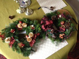 Decorating our home for Christmas was an adventure. We didn’t bring decorations with us, except for a holiday table cloth. Our apartment is too small to accomodate a tree. So Abi and I decided to go to a wreath making workshop sponsored by WICE. The instructor is an expat who moved here with her French husband 20 years ago. Since she couldn’t work because of visa requirements, she developed a holiday decorating business. She brought supplies like ribbon and ornaments back from the States and sold her products at holiday markets. She also decorates the American Embassy for the holidays each year.