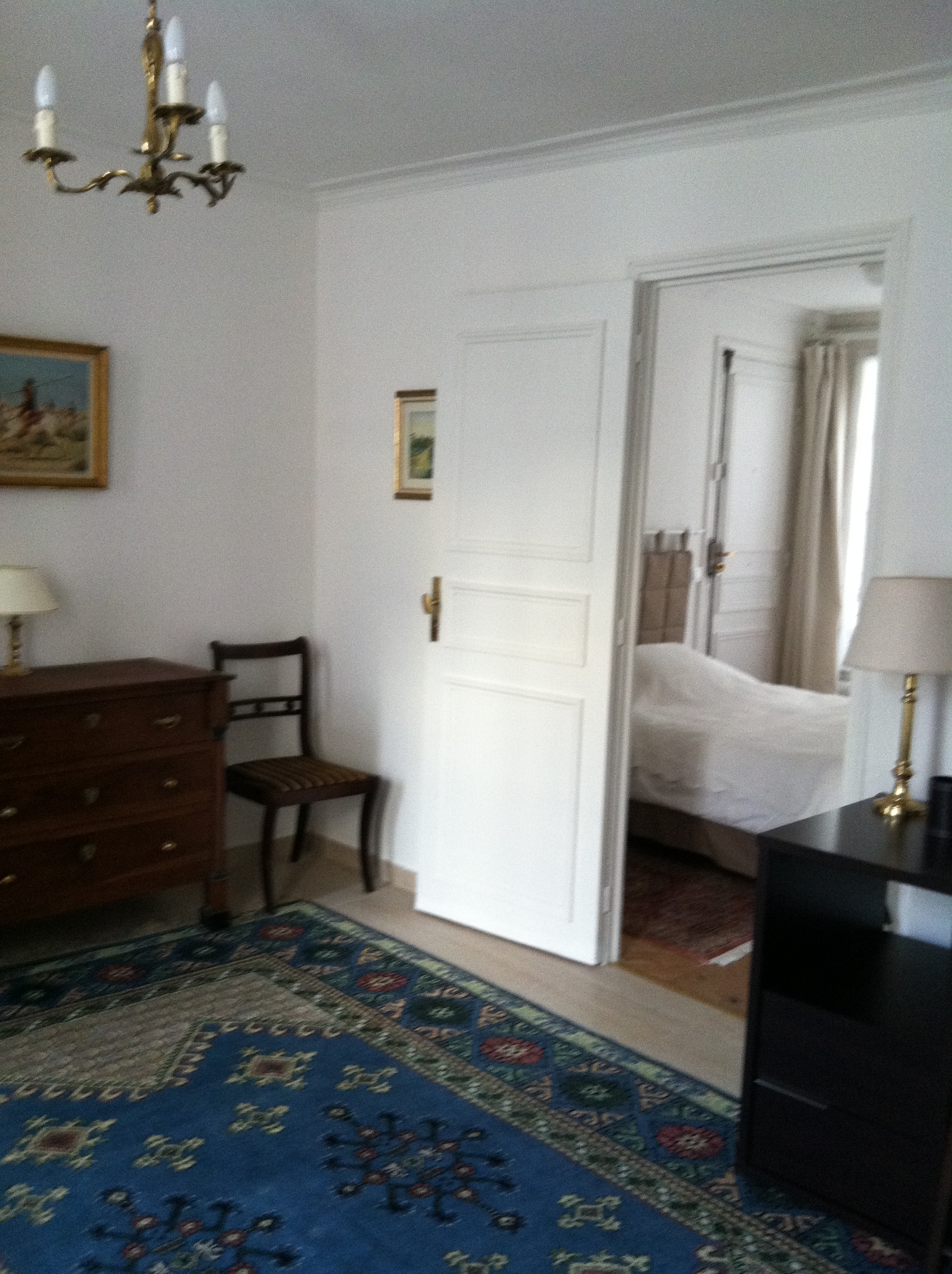 • le petite salon…with view into a guest room with bath.