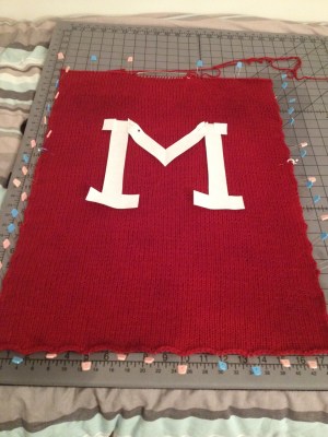 The back of McKenna's sweater with a paper M on it.