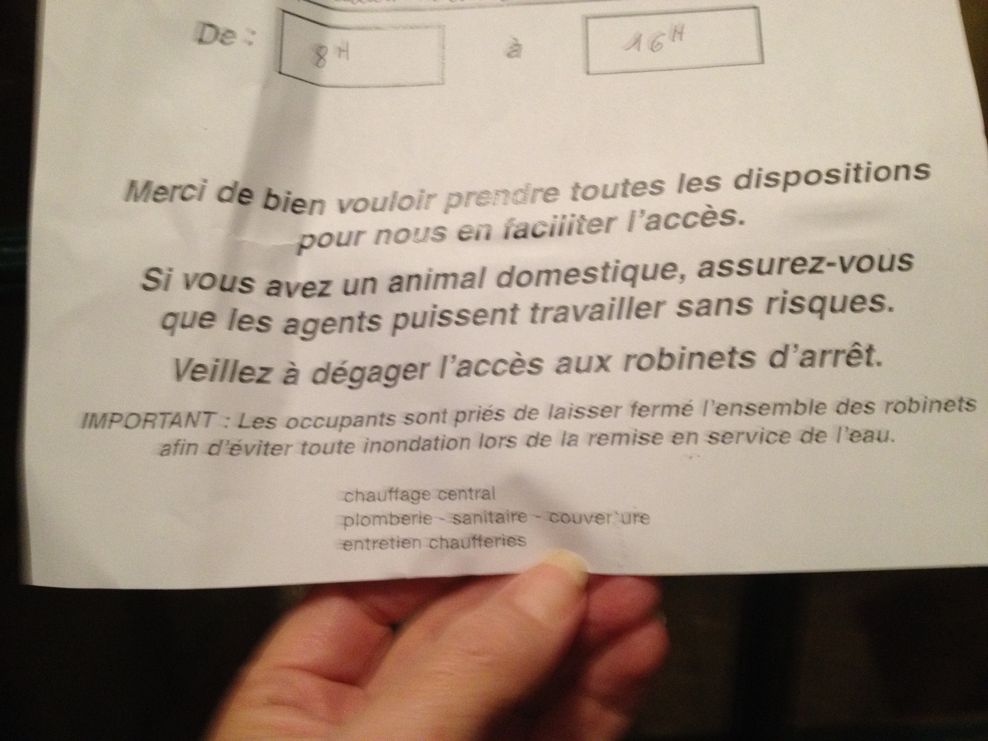 About the time that we figured out how long it took to do laundry this sign appeared on the door to our building…Although I do not speak French…I could kind of tell from the illustration that it had something to do with water…I met my neighbor coming out to walk his dog and confirmed my suspicions.  What that entailed for us was only doing laundry in the evening.  It also meant filling a bucket with water for toilet flushing and planning to be out all day…OH  and showers had to be taken before 8 in the morning (no sleeping in for Abi!).  We also filled bottles for drinking water.  but mostly we tried to be out.  They redid the pipes in the cave (cellar) and took out all the cool water fountains in the hallways from the days before running water in each apartment.  Then they used the place where the old pipes were to hide all the electical wires that were running in pipes along the outside of the walls. It took about six weeks.  Everytime we thought we were home free and decided not to keep a bucket in the bathroom because the water had been on all day…the water would be off…  We were glad that they finished the project before our Christmas company came!