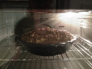 We hadn’t been here very long, and it was a regular work day for Joe, but Abi wanted to have Thanksgiving dinner on THE day.  Joe came home a little early.  Abi and I went to the butcher and bought filet mignon…au porc to make our favorite herbed pork medallions (pork tenderloin) out of the Best Recipe Cookbook.  We bought apple pear sauce…apple sauce with chunks of pears in it, had roasted veggies and lit candles.  We also made Missy B’s  very delicious apple crisp for dessert.  A turkey for three seemed a little silly and you have to order turkeys weeks in advance.  Good thing our boxes came from Paris so we could break out the pie plate! Since this was our first baking effort we learned that it isn’t a good idea to  use the fan (kind of like a convection oven but not really) when you bake unless you keep a careful eye on things…it will be very done on the top and not so done in the middle.  We also had to experiment with brown sugar substitutes…we are using something called  muscovado which you can buy at the Bio…(pronounced like the abbreviation for body odor) which is a health food store.    It has a hint of molasses taste in it and is a similar texture to our brown sugar.  Since then people have told me that you can make brown sugar with white sugar and molasses…but we haven’t found molasses at the local super market.